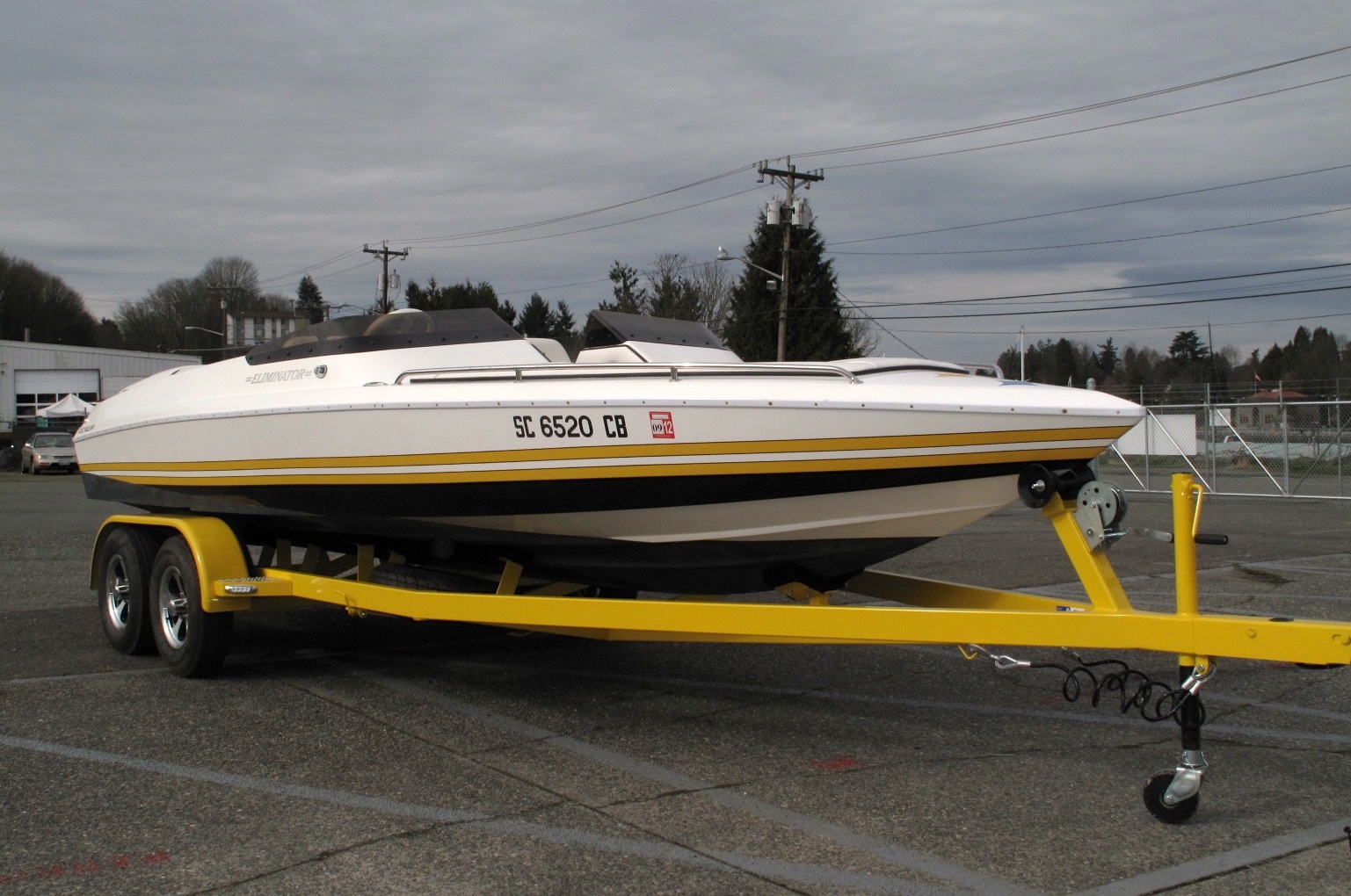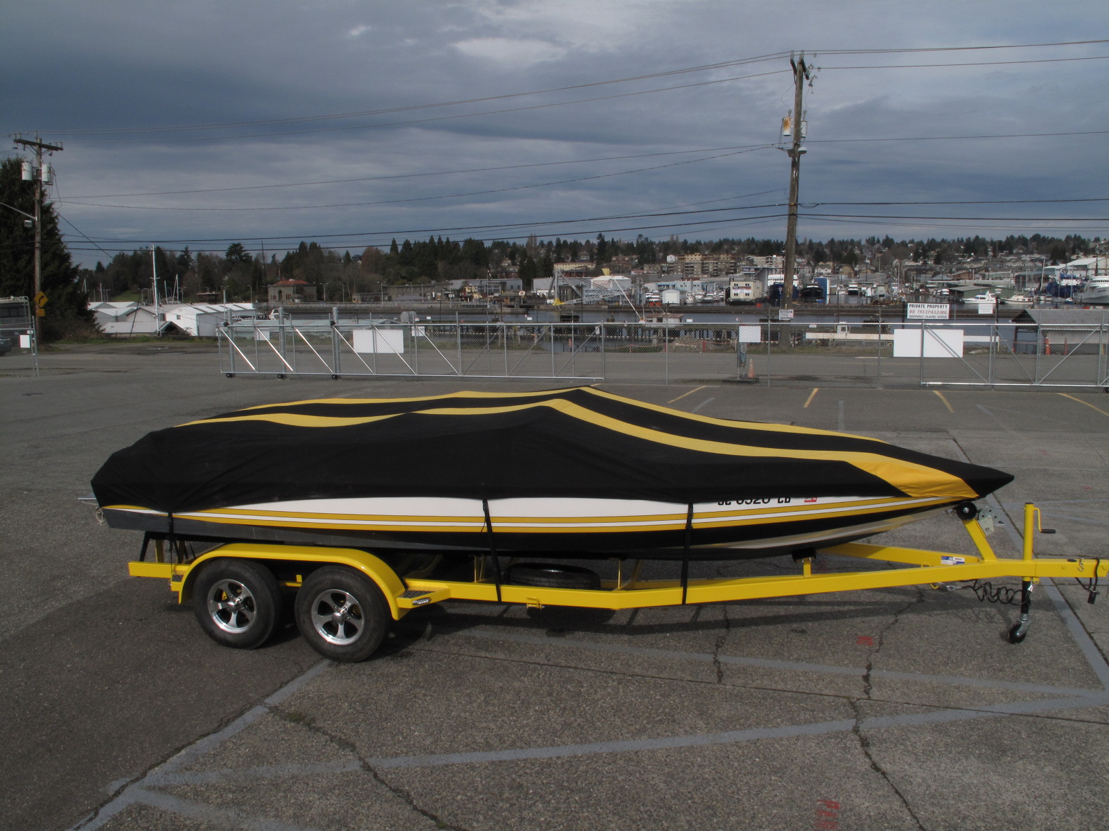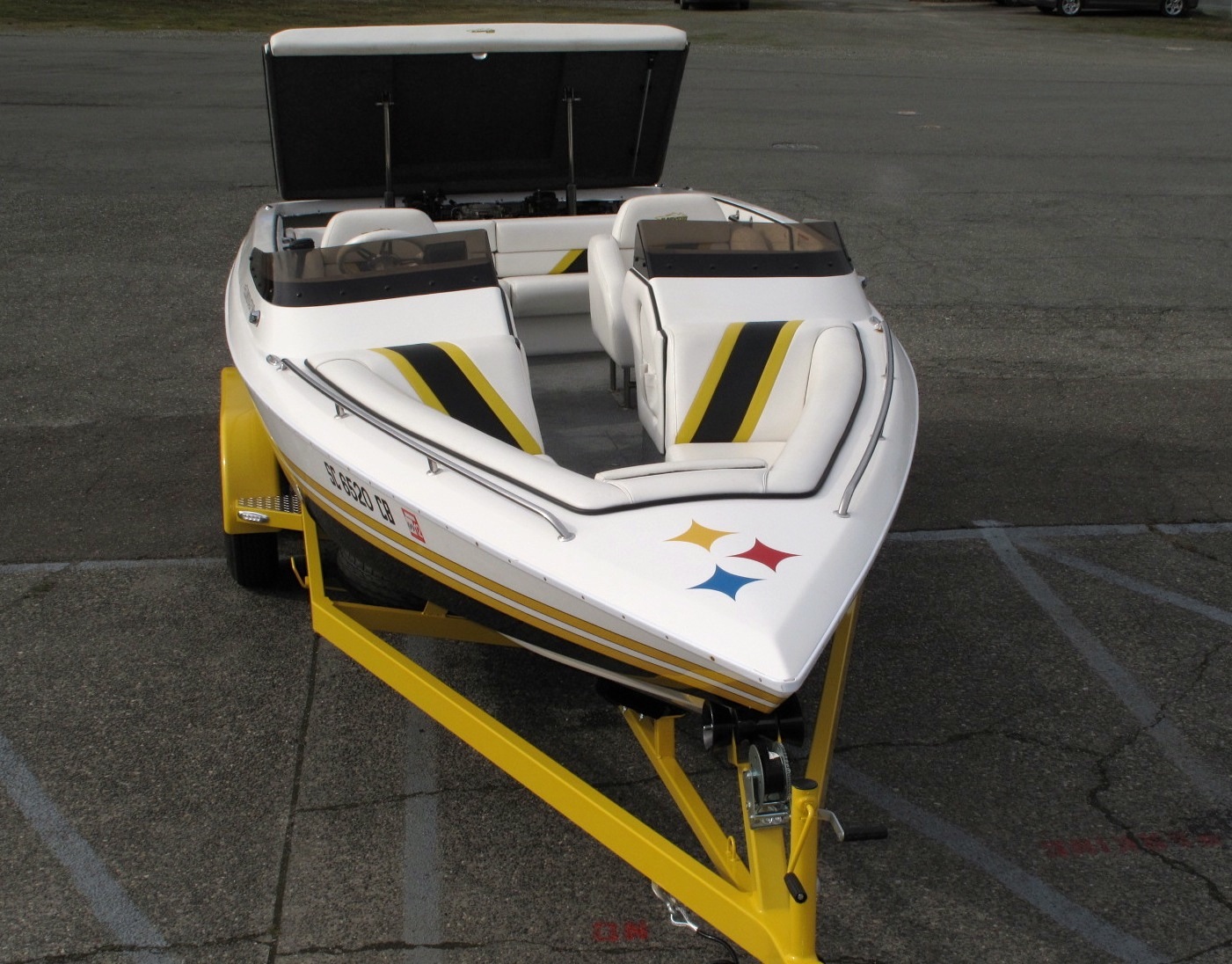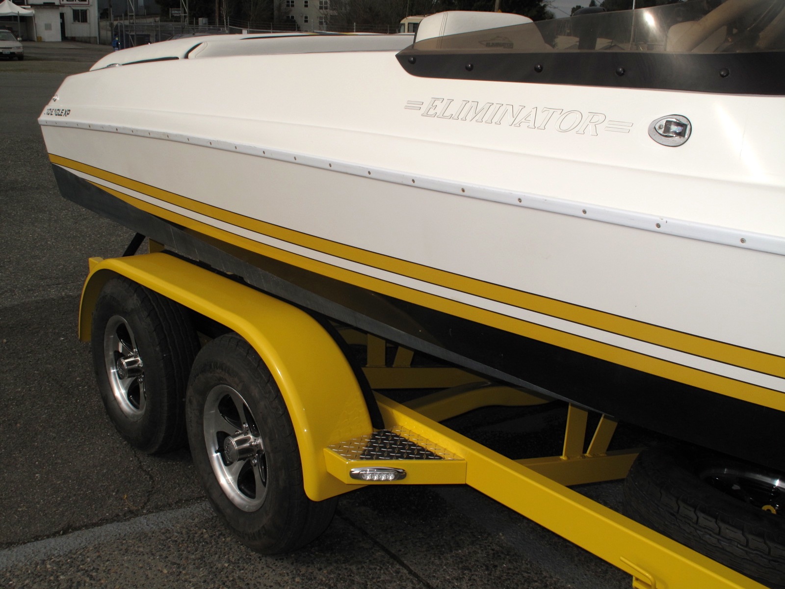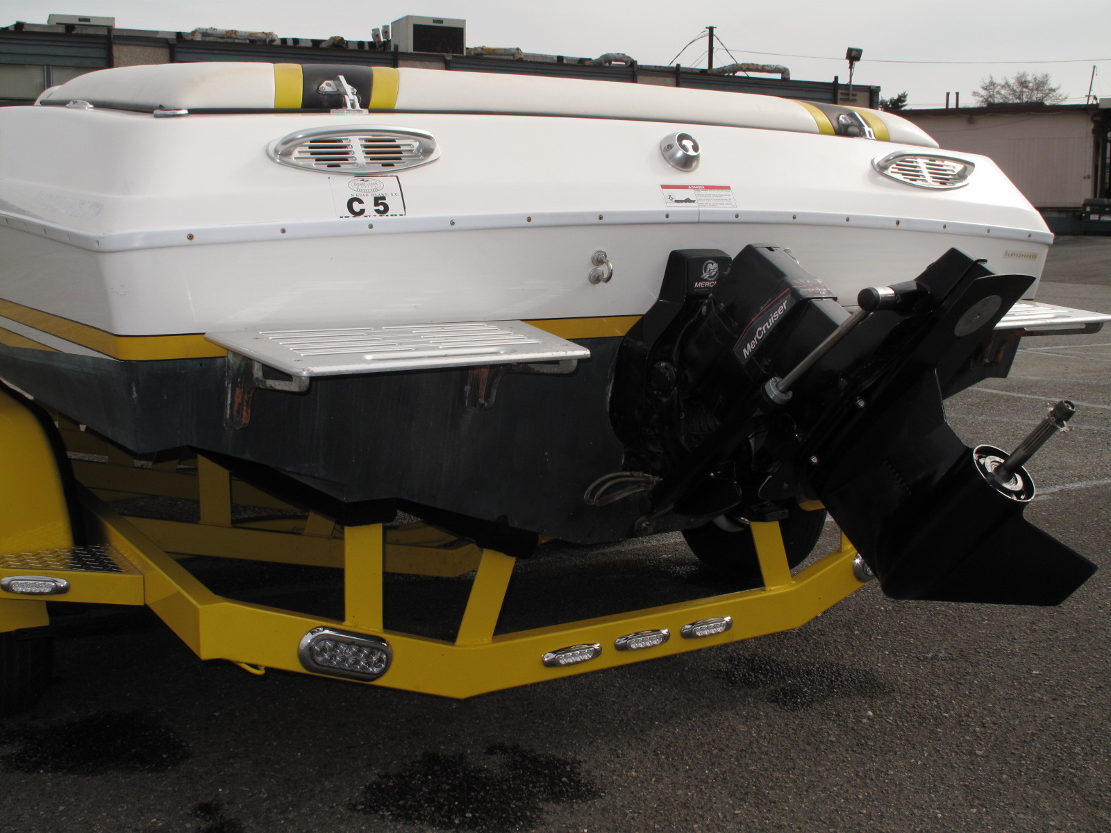 She’s also got a brand new custom-painted trailer from Competitive in Los Angeles, built to fit this specific boat. We had it shipped up here from Los Angeles on a flatbed = no highway miles. Trailer has been in the freshwater one time to load the boat to it. Dual axle, surge brakes, LED lights, seven blade connector, sharp looking alloy wheels with a locking spare, and not a single scratch on it. Well, we did put five miles on the tires bringing it around to our storage area.
