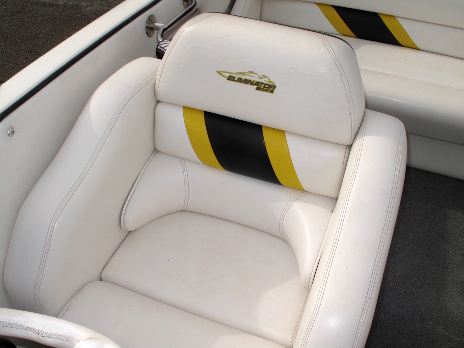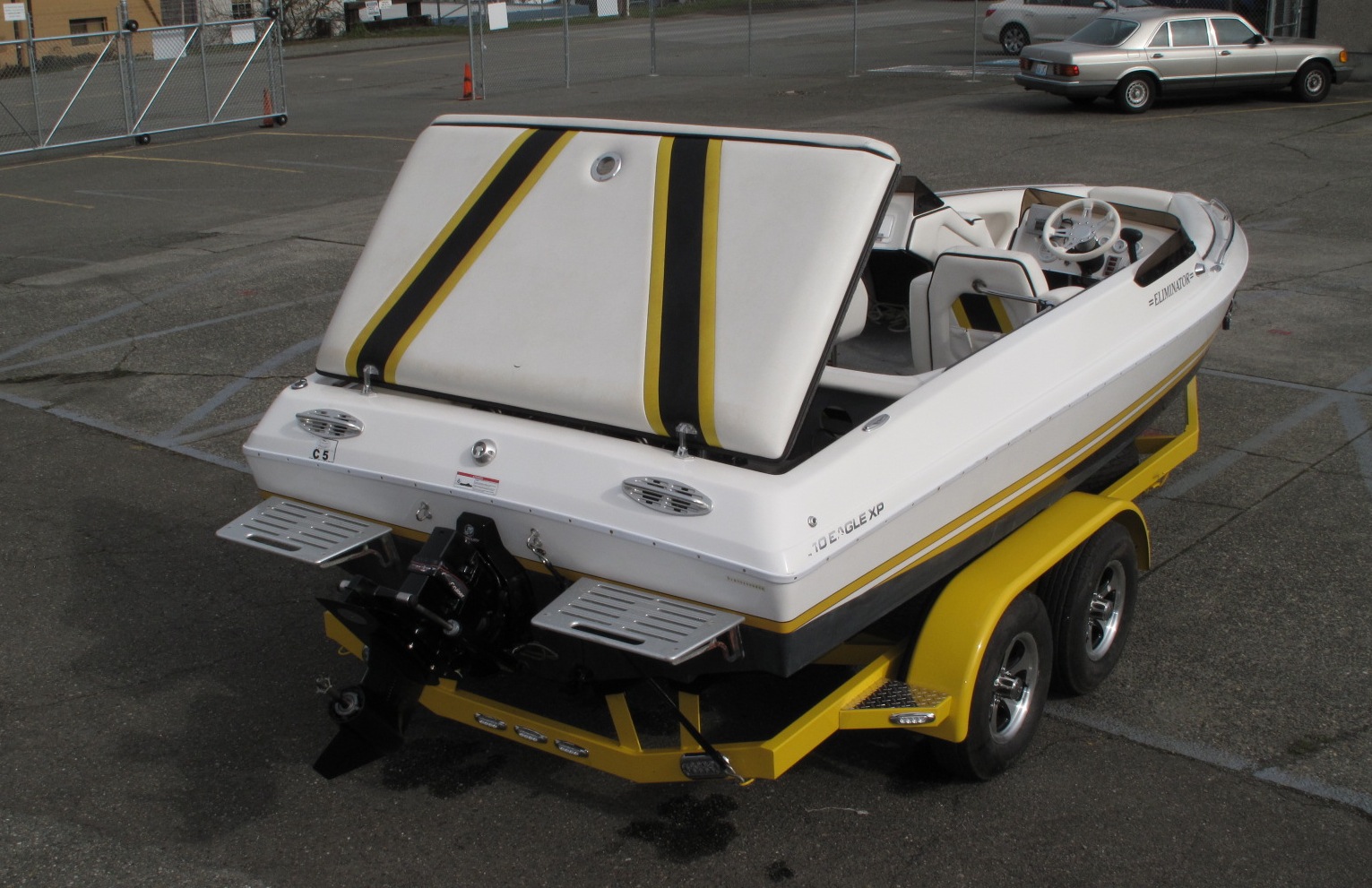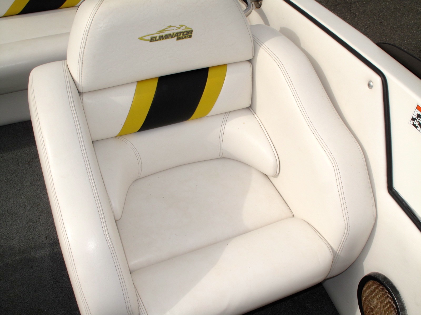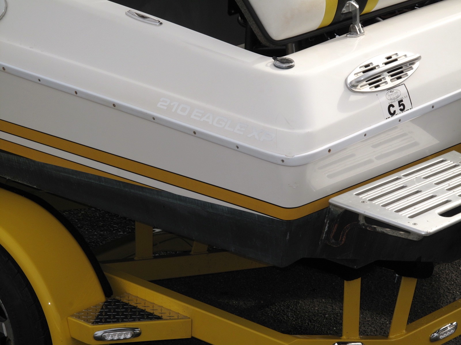 This Eagle 210 XP is in ‘like new’ condition, very clean and shows beautifully. She’s been fully detailed inside and out. Beautiful white upholstery with black and gold inserts and trim, matching paint accents and insignia, and the hull finish sparkles.