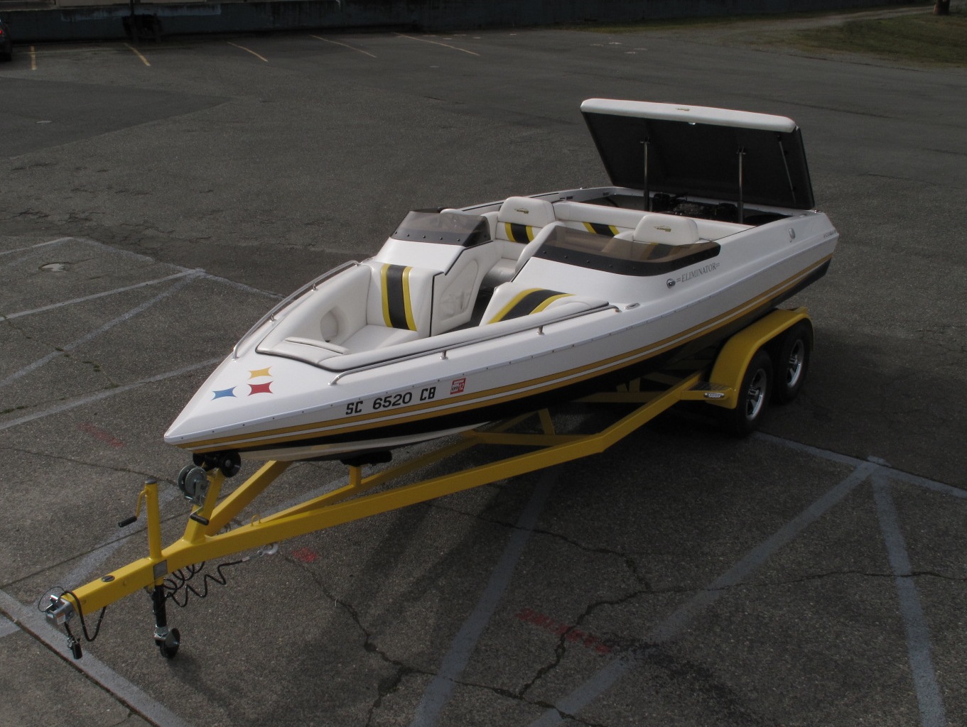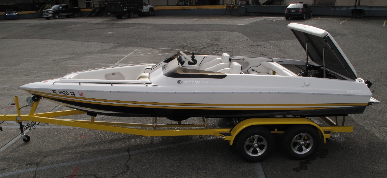 The boat was originally purchased by a very generous couple who wished to support a benefit sale through a large charitable event in California. They purchased the Eliminator as a part of that benefit and the boat was shrink-wrapped and shipped new to South Carolina in 2008. It was only used two or three times and then laid up due to an engine failure, being the result of a faulty head casting that allowed water to the block. She was covered and placed on indoor rack storage for the next three years.