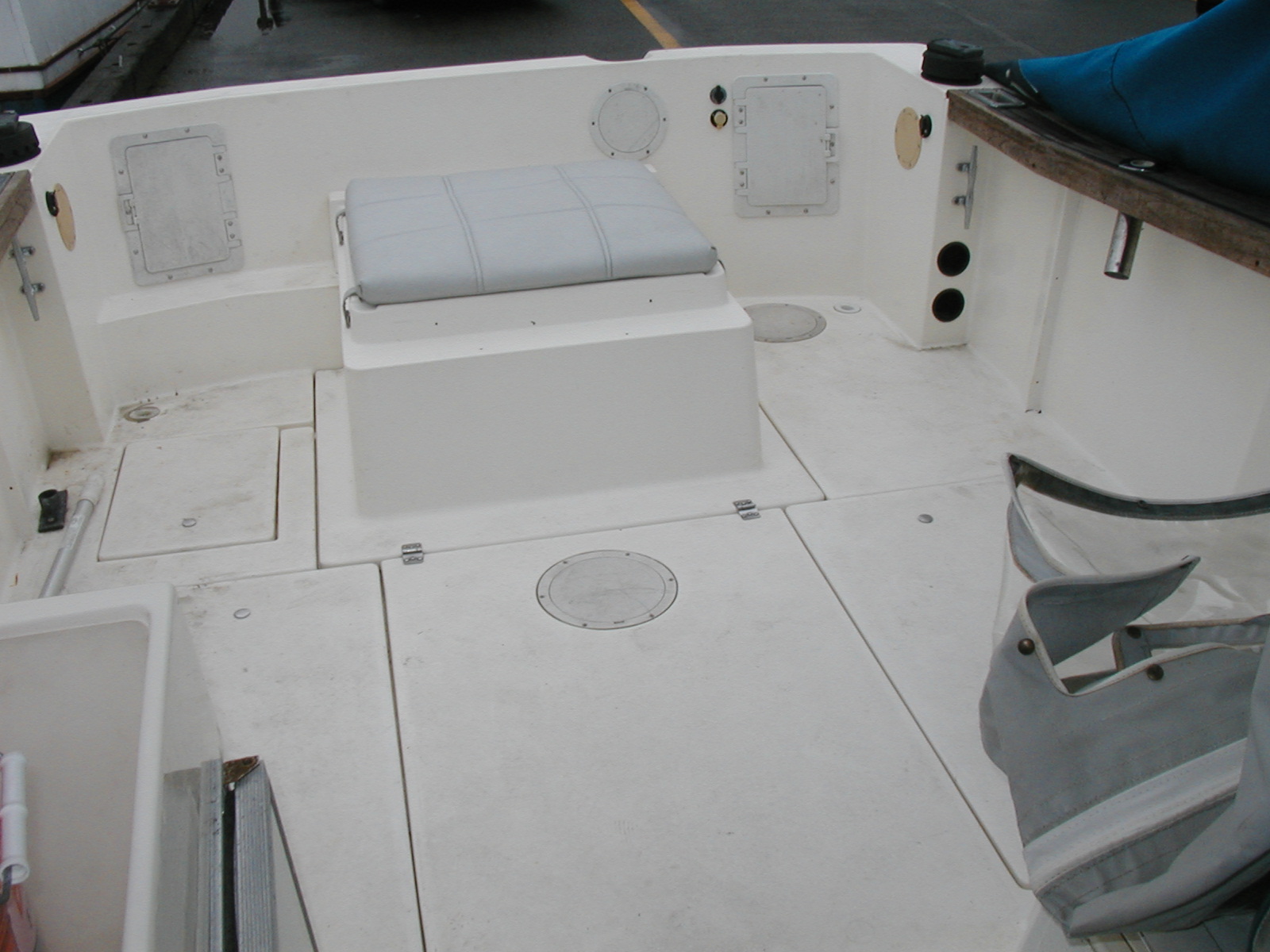 Gear onboard includes CB radio, VHF radio, depth sounder, flares, lifejackets, new mahogany trim pieces for aft deck.