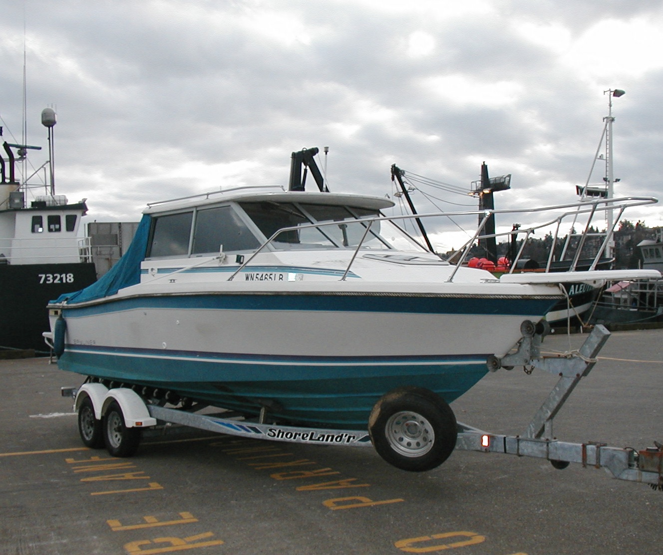 She has a small refrigerator on aft deck with galley sink, two bait wells, stereo and a canvas aft deck cover. Comes with Shorelander double axle trailer.