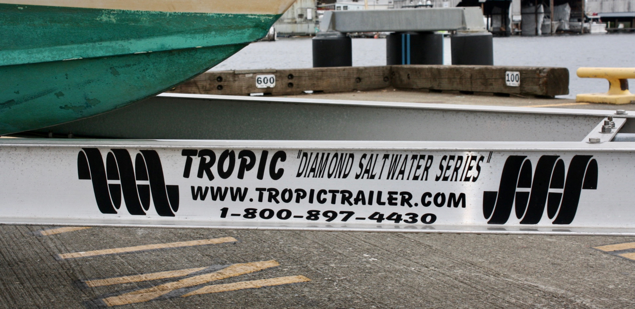 2006 ‘Diamond Saltwater Series’ triple-axle aluminum I-Beam trailer with surge disc brakes on all wheels. 9,900 GVW with ST205 75D14 tires in very good condition, plus new spare on trailer tongue.  Overall length 30’.
