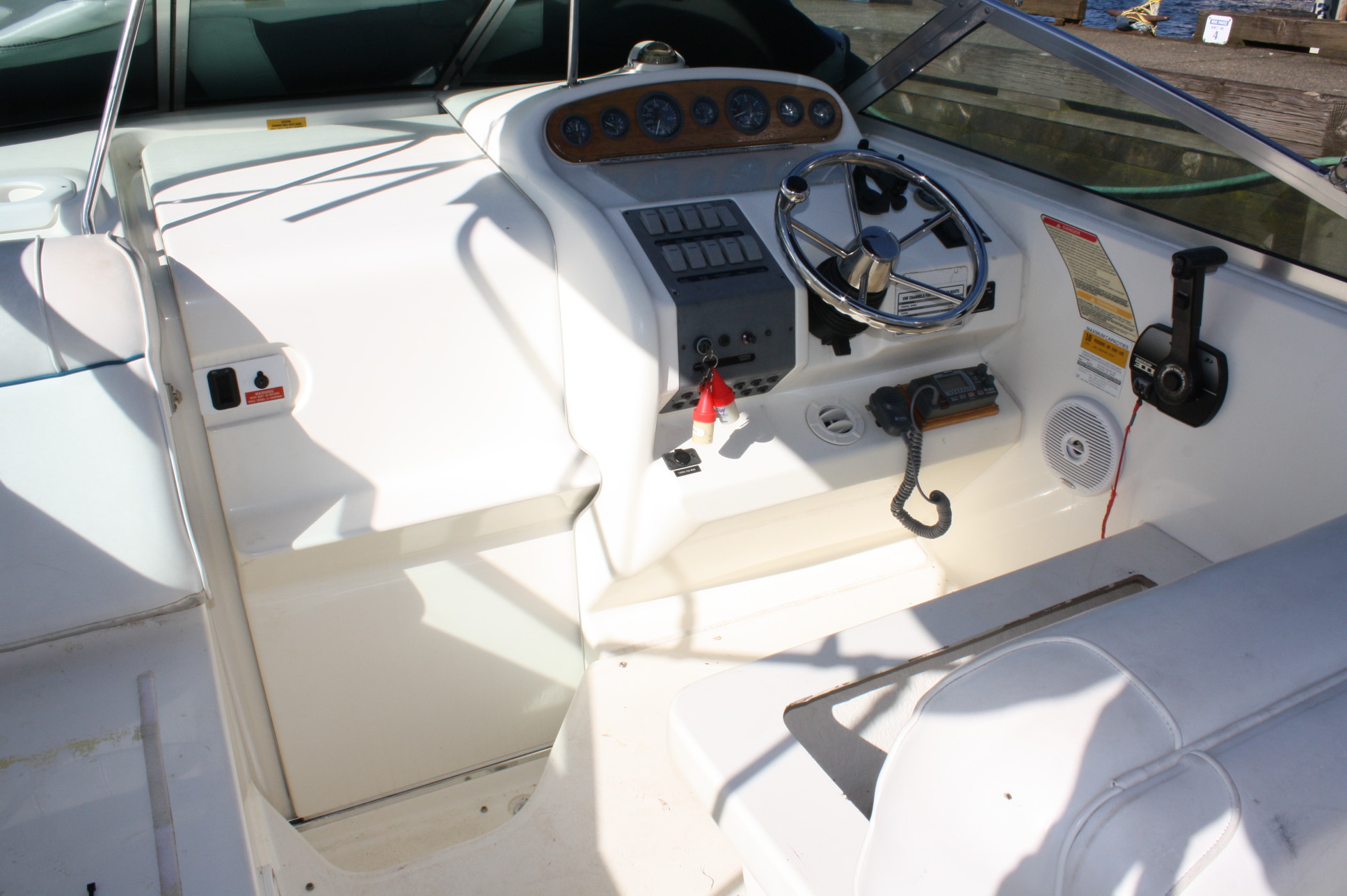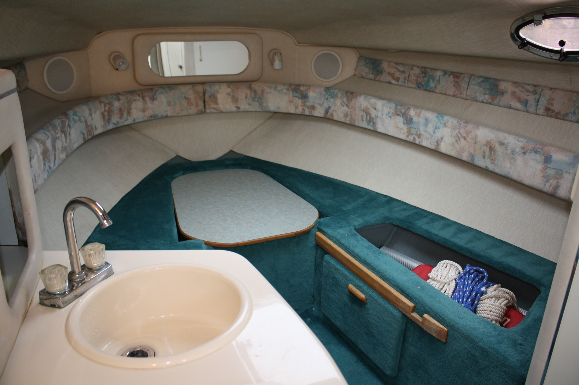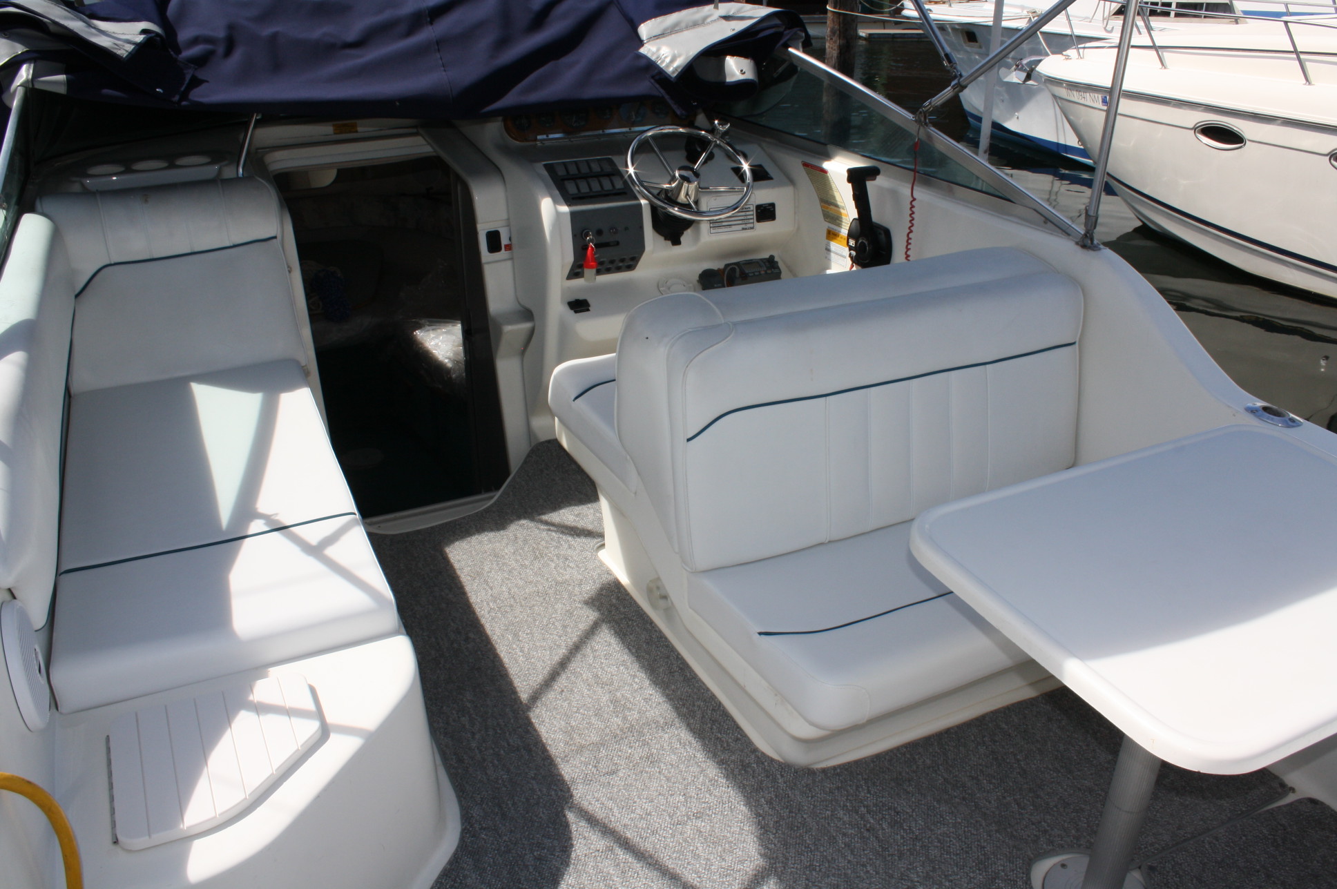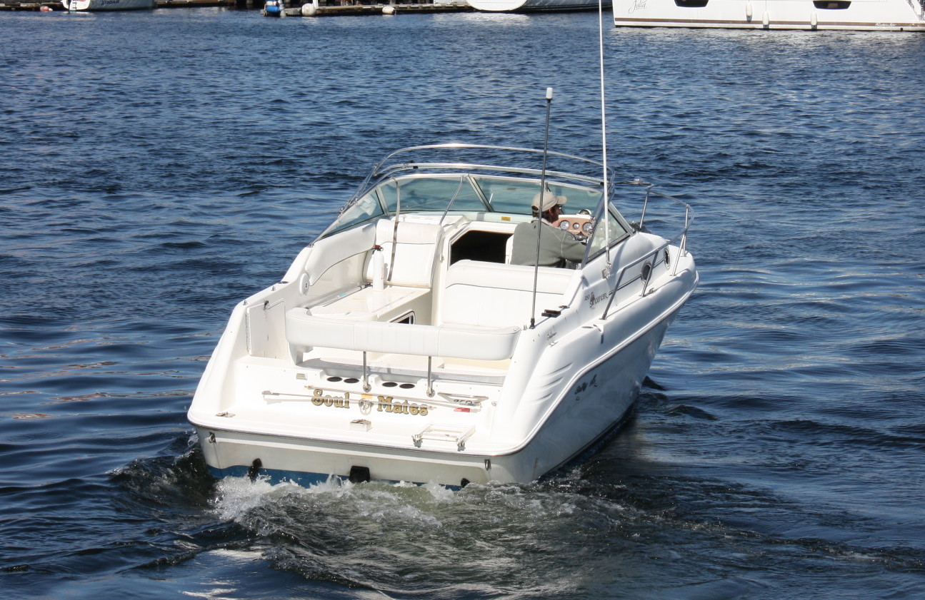 This is just a partial list of what’s been done to get her back into good condition since she arrived at our docks last winter: a thorough cleaning inside and out; bottom sanded, prep and painted, outdrive inspection, tilt rams replaced and prop polished; hull survey; professional mechanical inspection; new VHF radio; new filters and oil change plus compression test with excellent results; carpets and interior cushions professionally cleaned, etc. We’ve even got newly upholstered cushions for the aft cockpit. In other words, we’ve just taken care of all that “repair stuff’ you didn’t have time to do, nor wanted to pay a yard to do for you. Now, you just get the FUN!