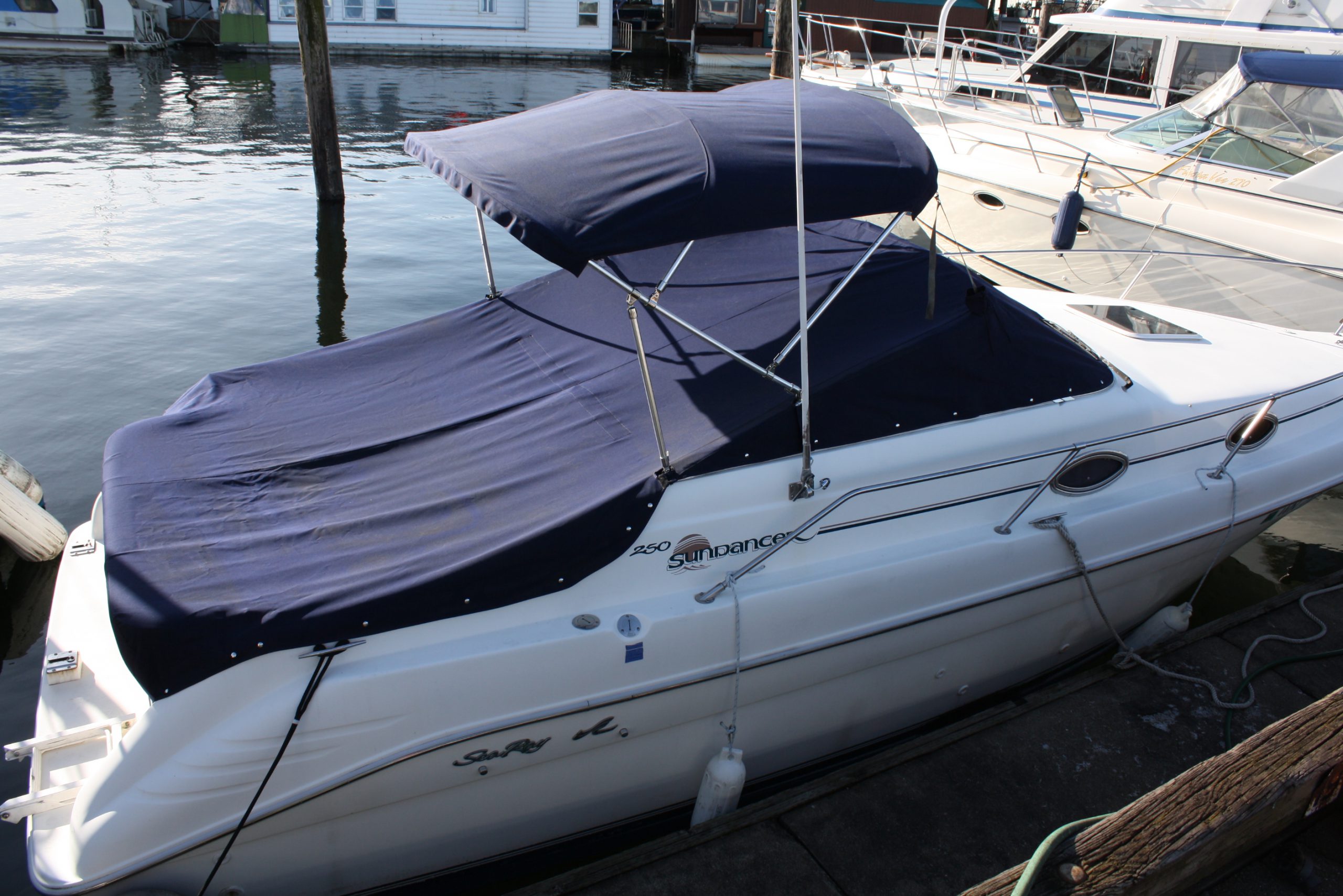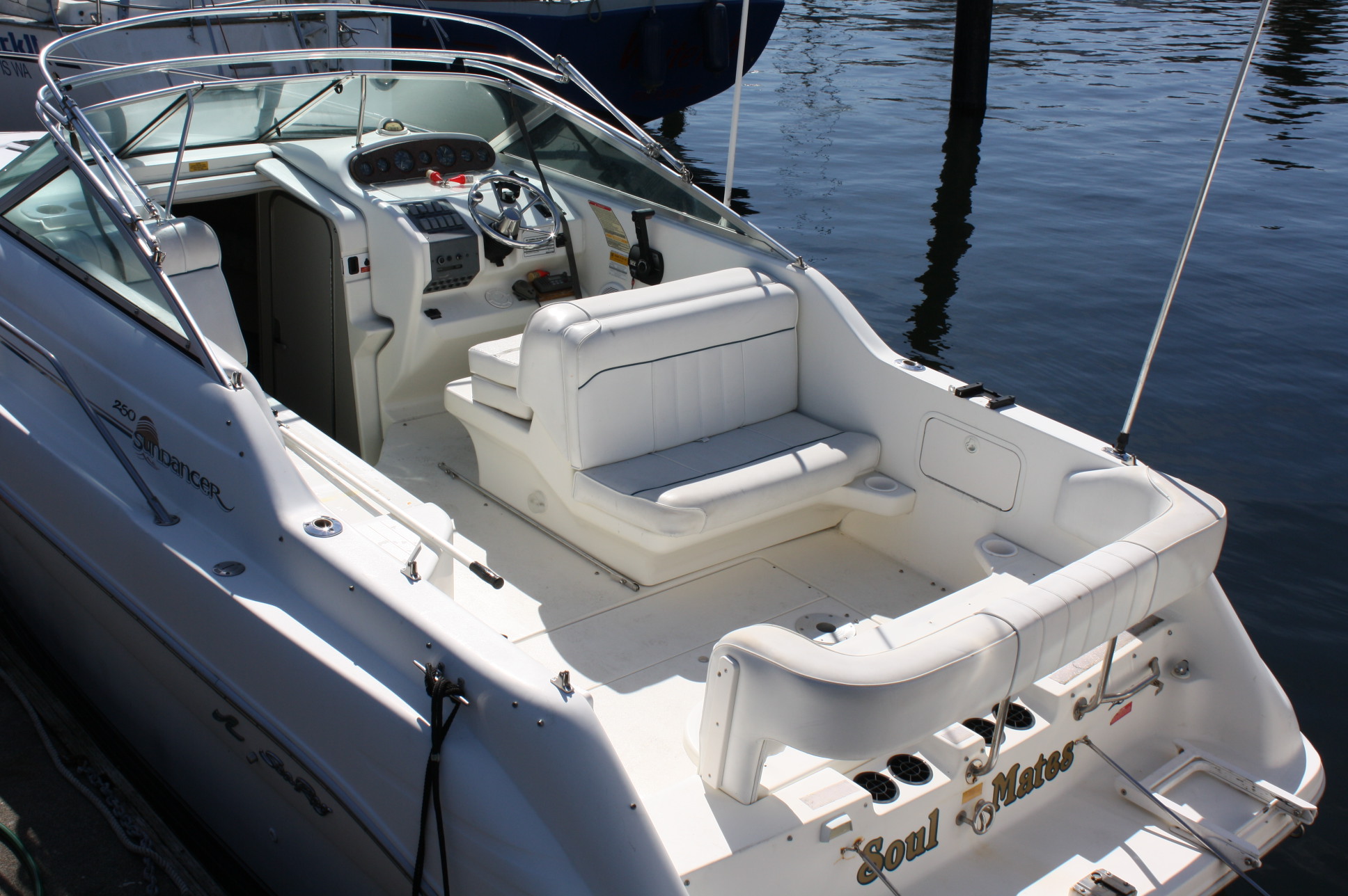 Here’s a fabulous 250 Sundancer, a well built Express Cruiser for summer fun. A great family boat with separate sleeping areas for kids, or, sleeps four adults. MerCruiser 383 Stroker (5.7) and Bravo III duo-prop drive – with only minimal use since repowered – and yes, you can ski with her…she’s fast !