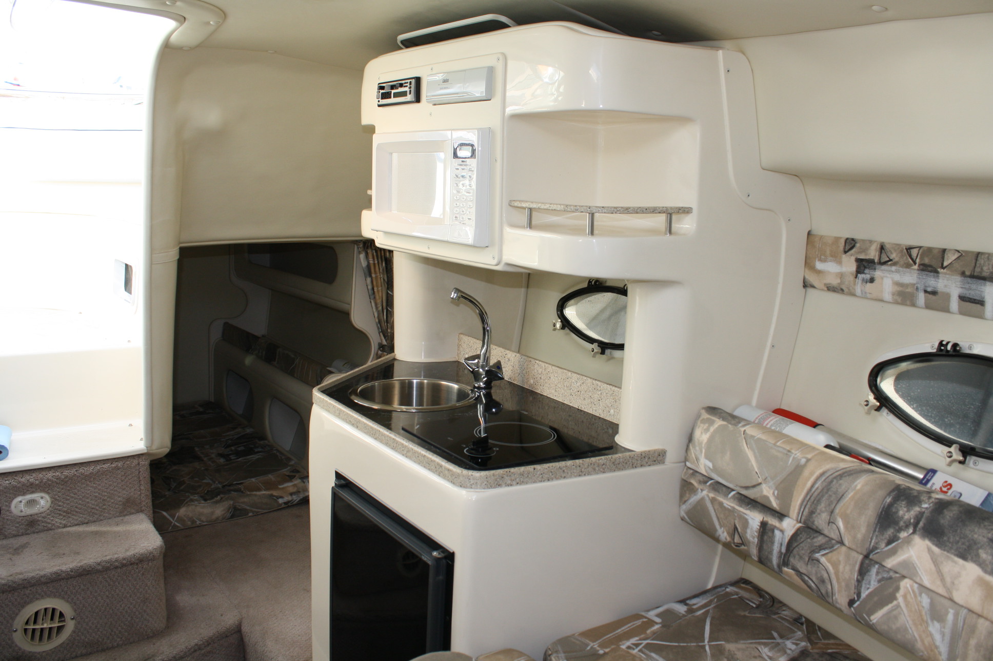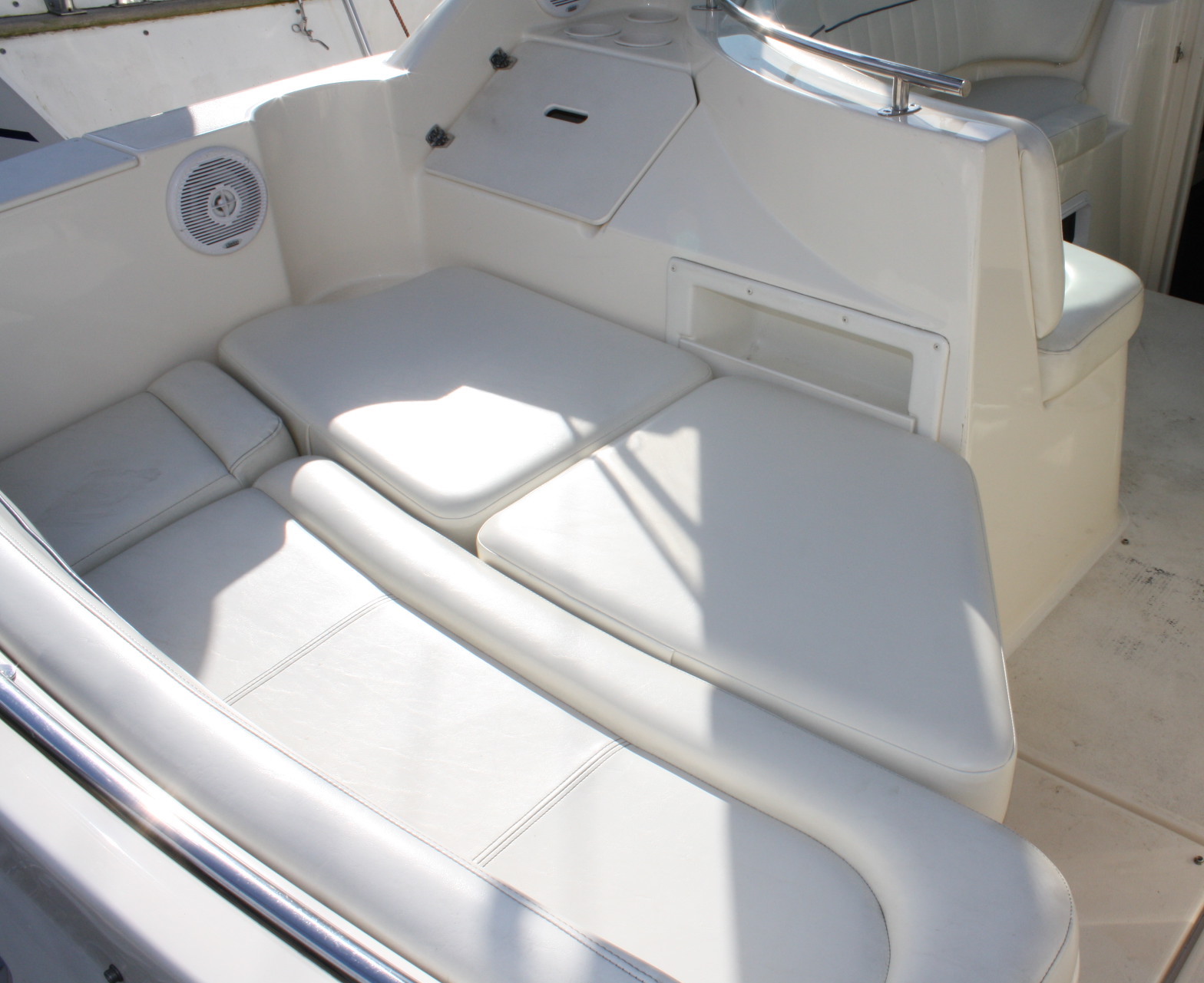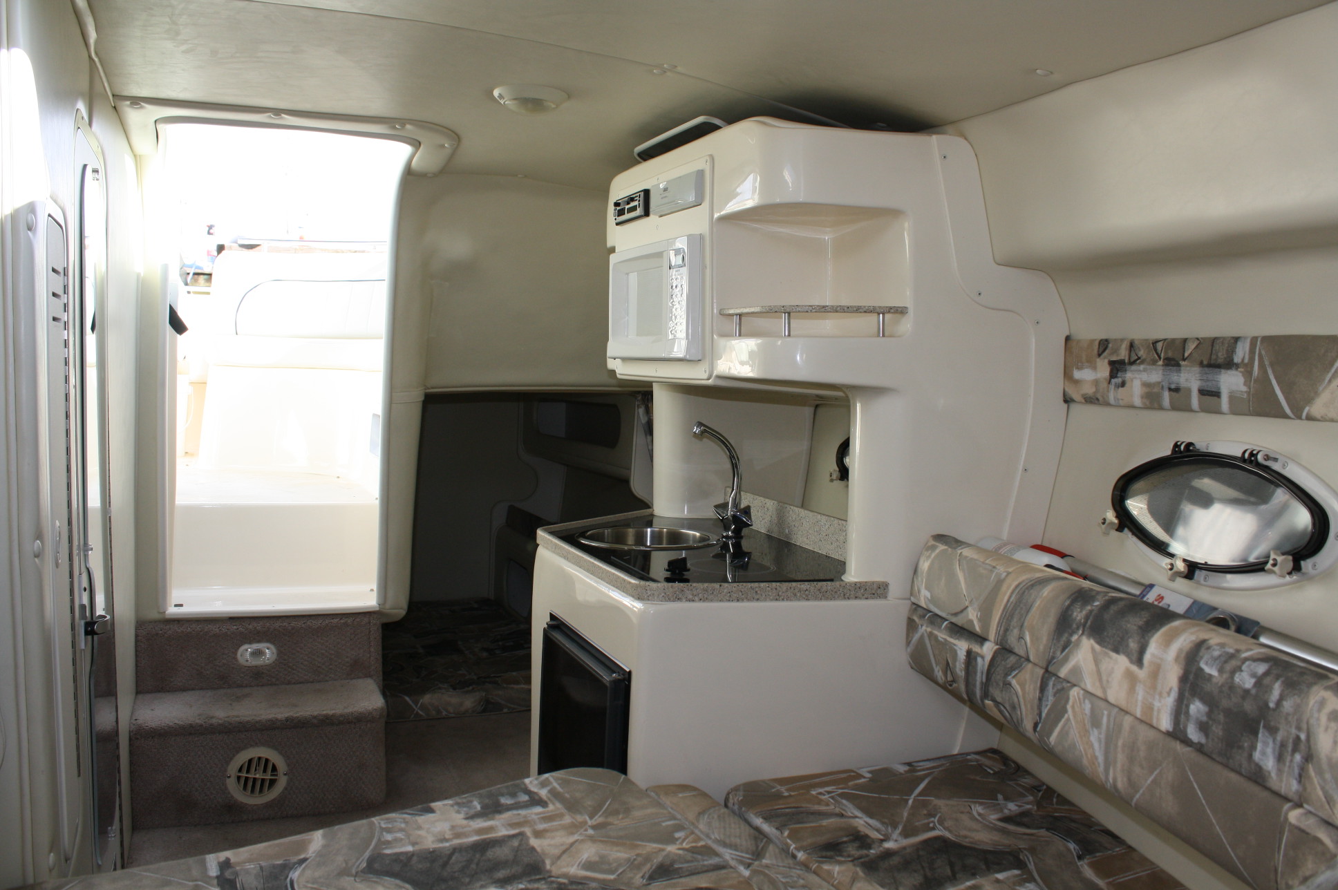 She has a very nice cockpit seating layout with curved helm settee, helm seat and a transom bench – all of which are in excellent condition. There is a convertible bench for the aft area to make a ‘sun deck’. Add in a cockpit bimini and full cockpit enclosure, as well as a full boat cover for long term storage. We’ve just had the full cockpit carpet set and the interior carpets and cushions professionally cleaned as of 12/15/17.