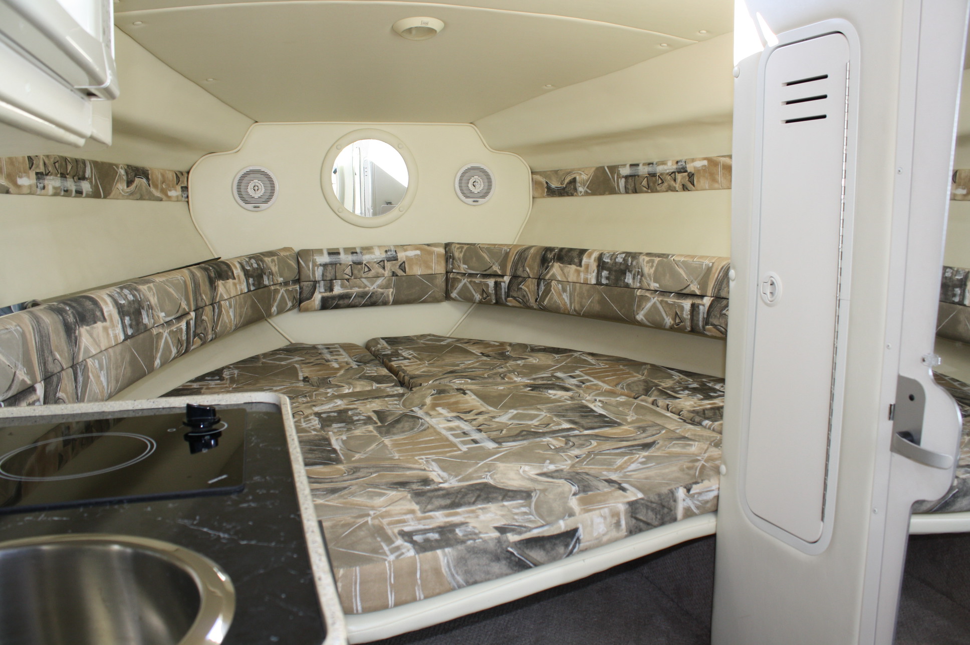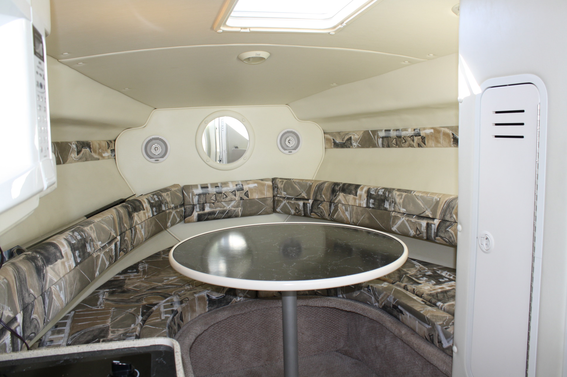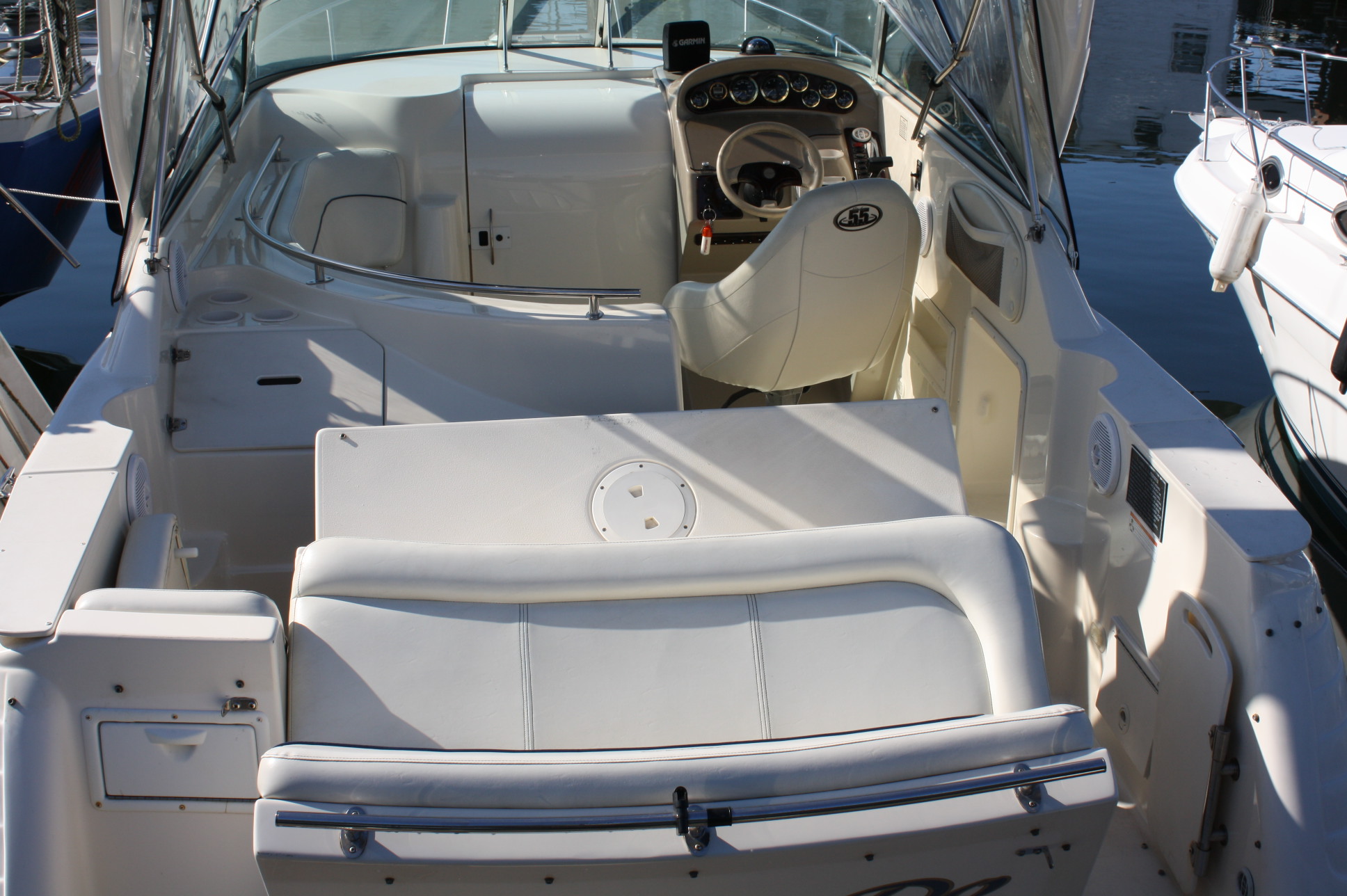 She has a very nice cockpit seating layout with curved helm settee, helm seat and a transom bench – all of which are in excellent condition. There is a convertible bench for the aft area to make a ‘sun deck’. Add in a cockpit bimini and full cockpit enclosure, as well as a full boat cover for long term storage. We’ve just had the full cockpit carpet set and the interior carpets and cushions professionally cleaned as of 12/15/17.