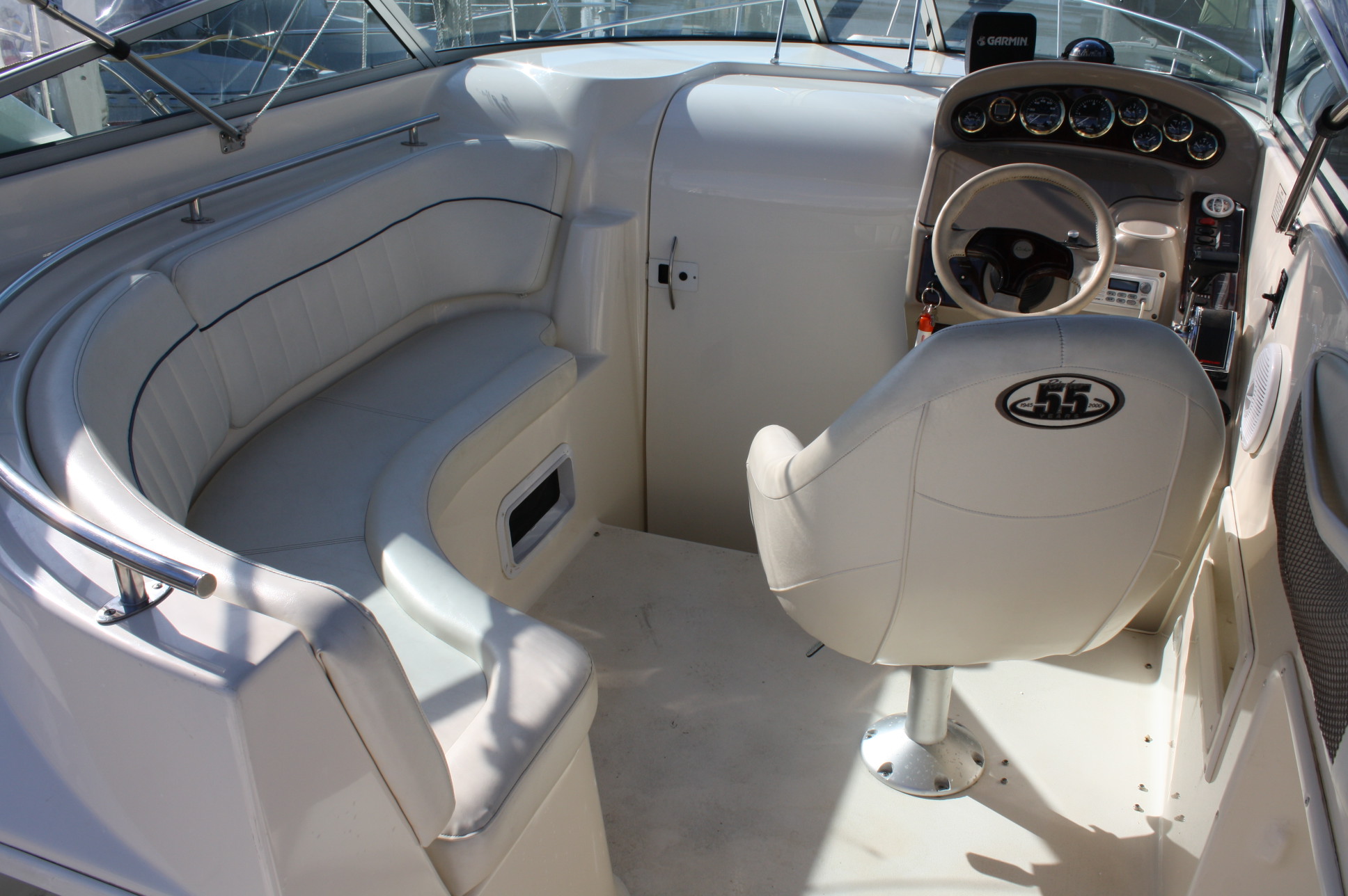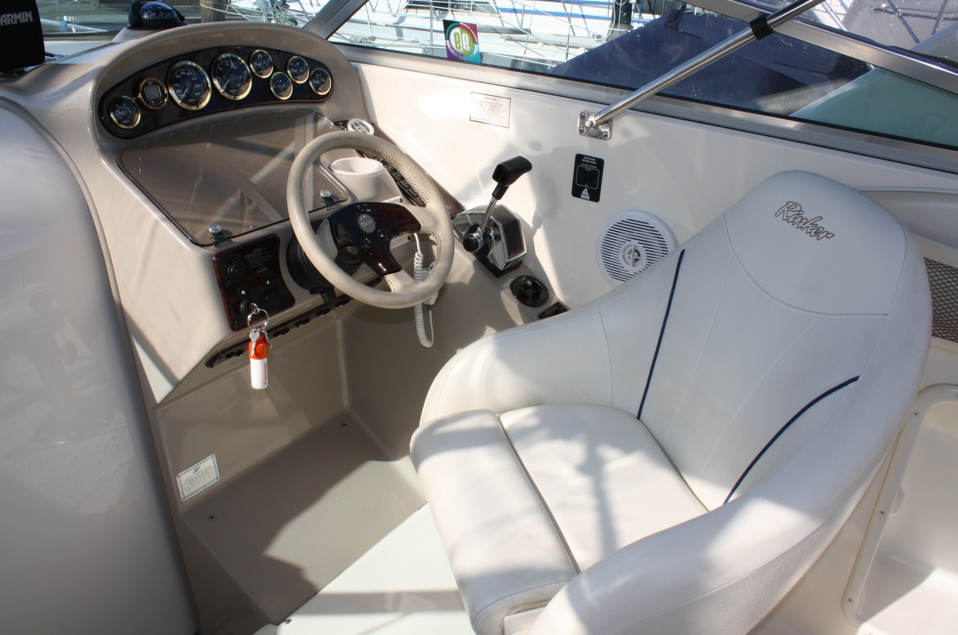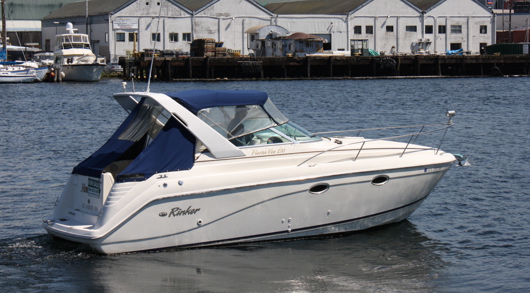 This 270 Fiesta Vee was used by the Rinker Boat Company as their showroom model for various boat shows and exhibits during the 2000 model year. It was purchased new in 2001 by her only former owner and has been stored in covered moorage since new. Former owner report approximately just 175 – 200 hours on the MerCruiser 5.7. Her Kohler genset has but THREE hours on it.