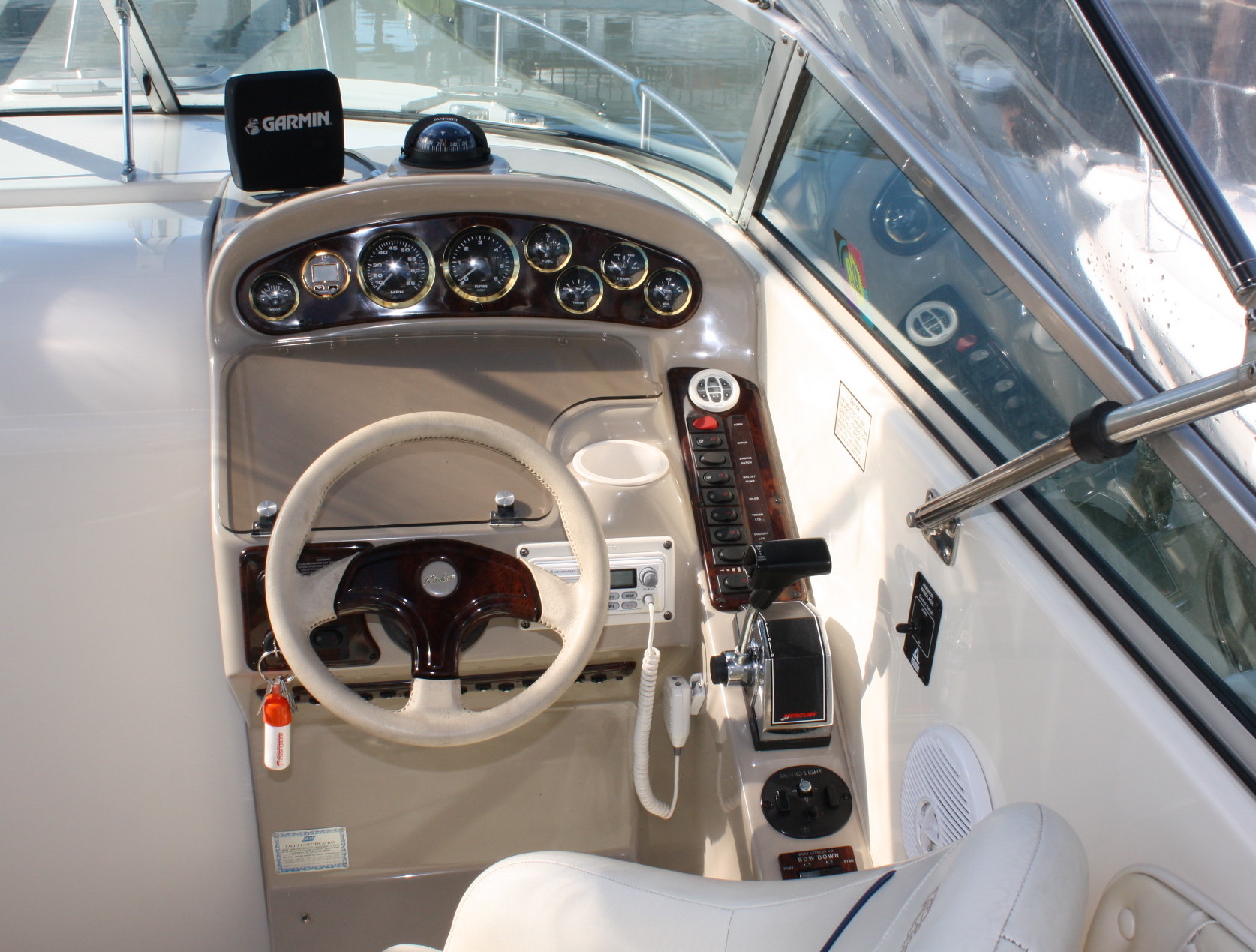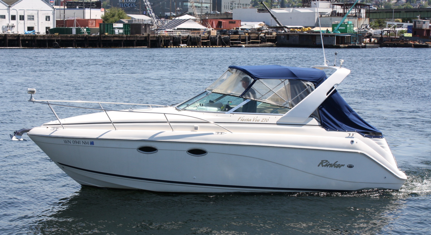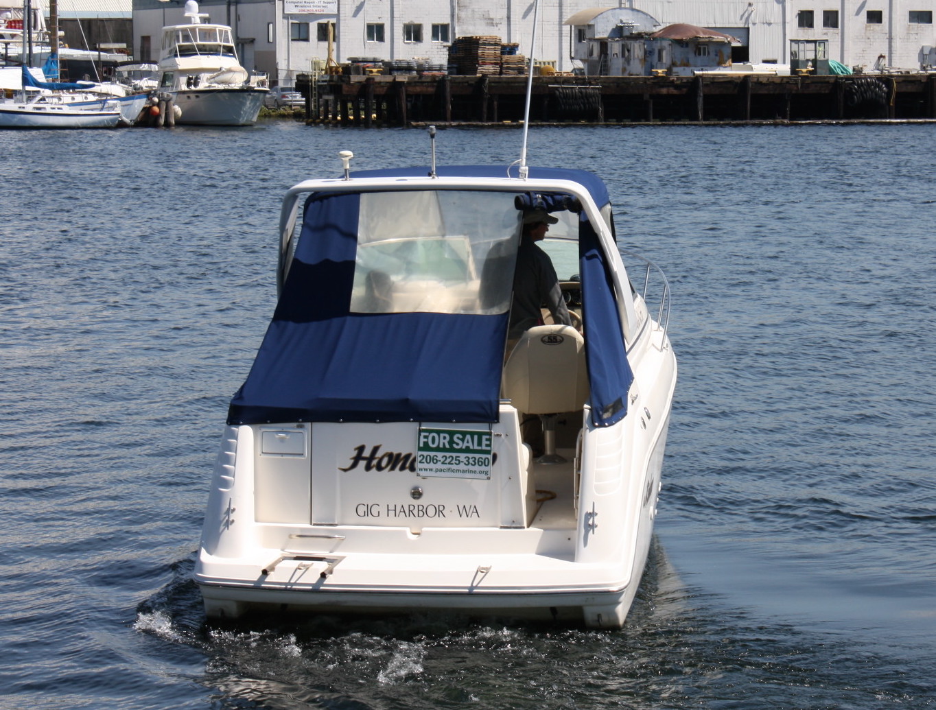 We ran the boat up to Seattle from Tacoma in about 15 kt NE wind. She’s comfortable in the waters of the Sound and cruises easily at 14 – 16 kts, with a top speed of about 30 kts. Full cockpit canvas enclosure is in good condition, we replaced the windscreen section with new panels, and there is a full boat cover for long term storage.