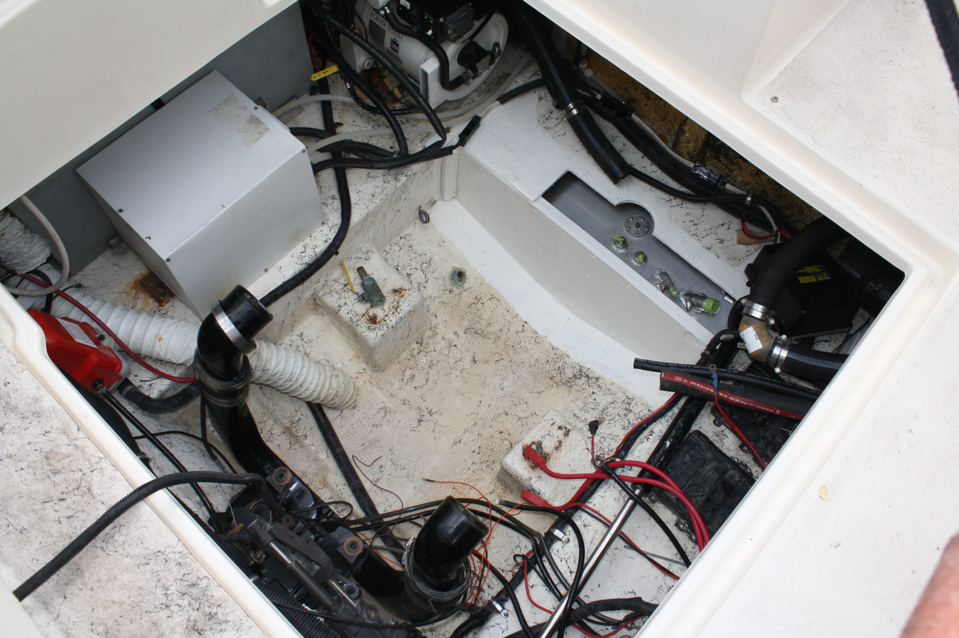 We had a new custom fabricated aluminum fuel tank was designed and built by S3 Maritime in Seattle in August. While the engine and outdrive were removed the tank compartment aft bulkhead was replaced with new marine plywood and secured, then fiberglassed in place. Thus you’ll see the newly painted area in the engine compartment photos.