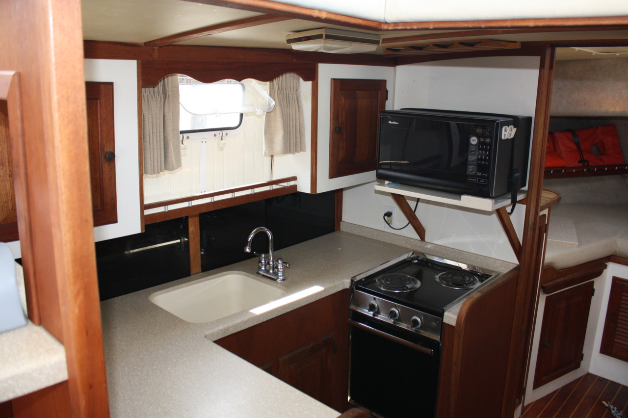 Perhaps the greatest advantage of this boat is that her single Perkins 6.35 turbo diesel will cruise economically at 7 knots on just 2 gallons per hour, and she’ll run 10 knots when desired.