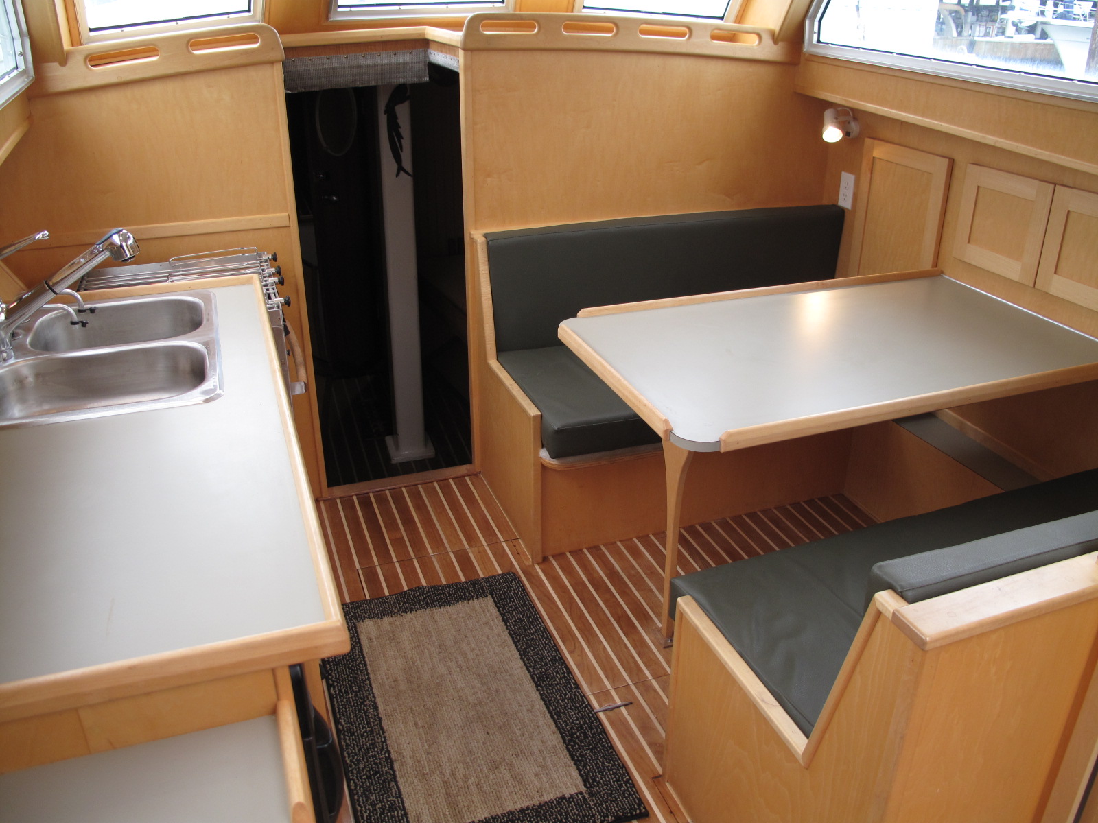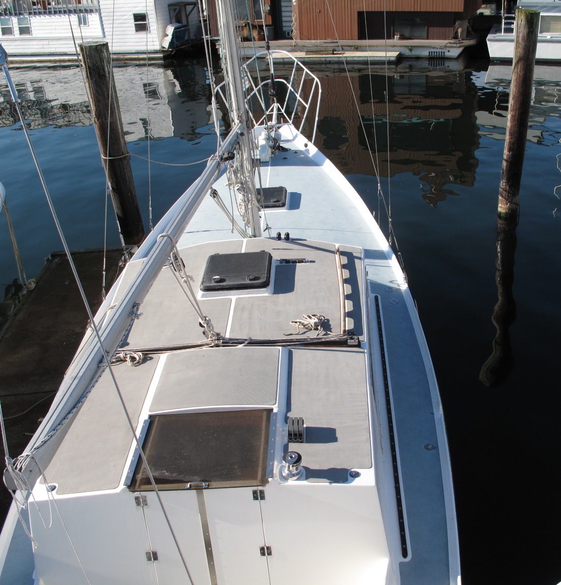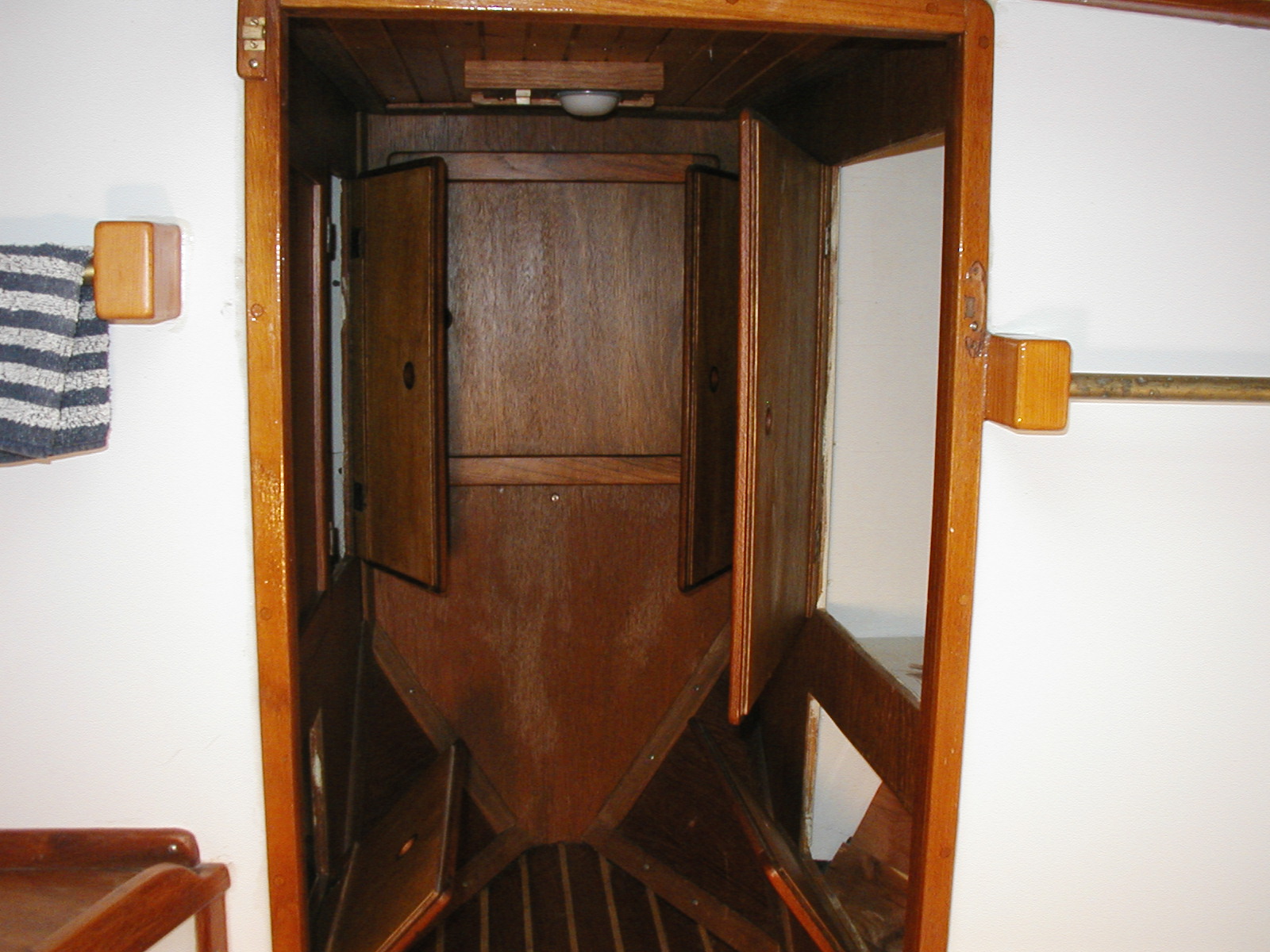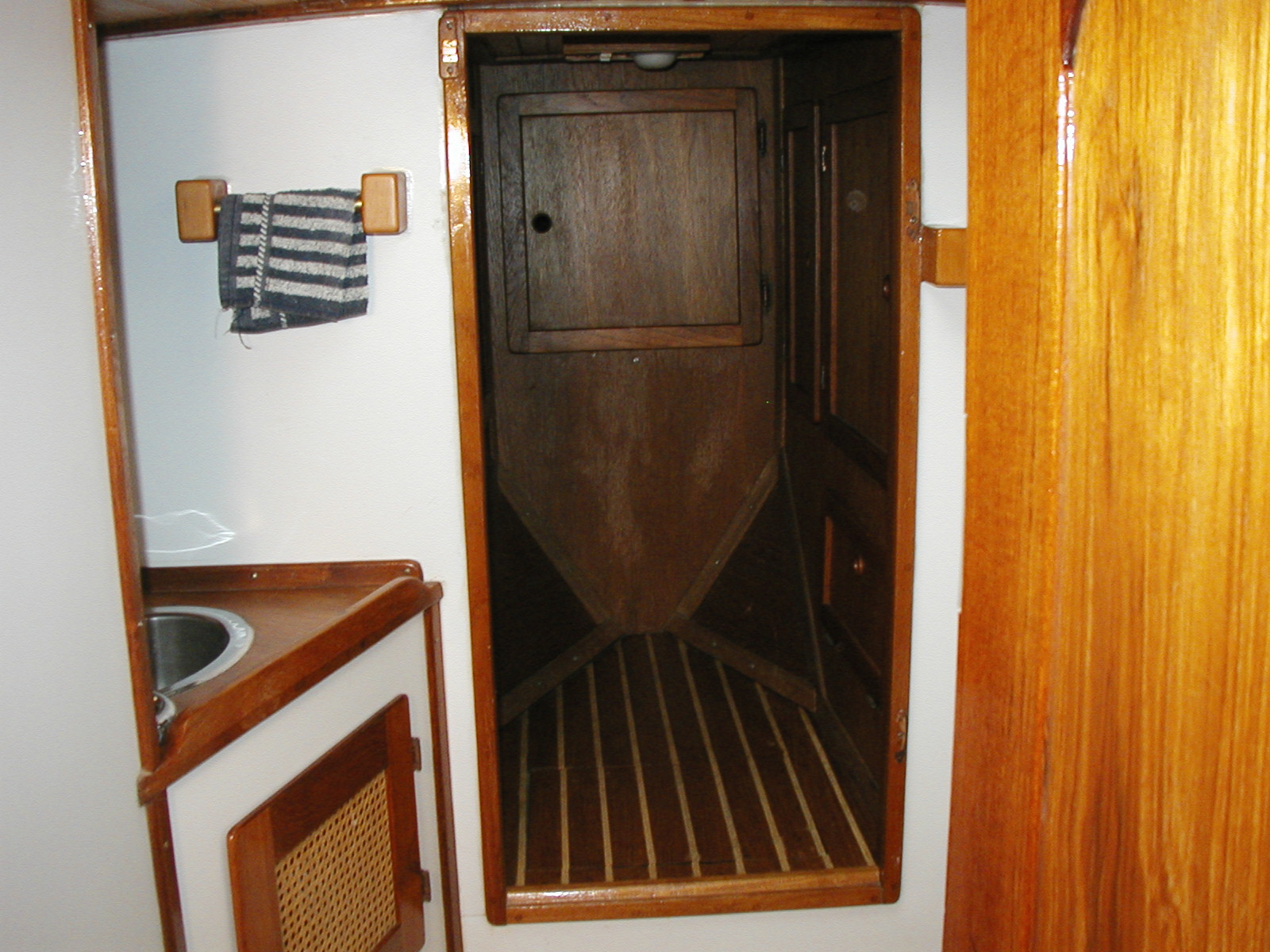 This unusual cutter rigged sloop underwent a complete rebuild between 2009 – 2012.  New fiberglass over wood deck was installed and the house was redesigned and rebuilt with custom aluminum framed heavy weather double windows.  She has all new fresh water and waste plumbing, almost all new rewiring, new lighting, new electric panels, new ‘teak and holly’ sole and a beautifully panelled main salon.
